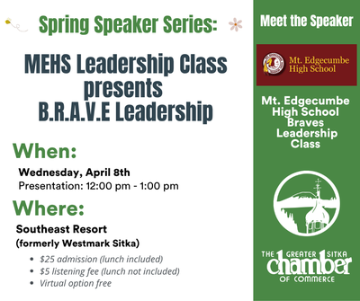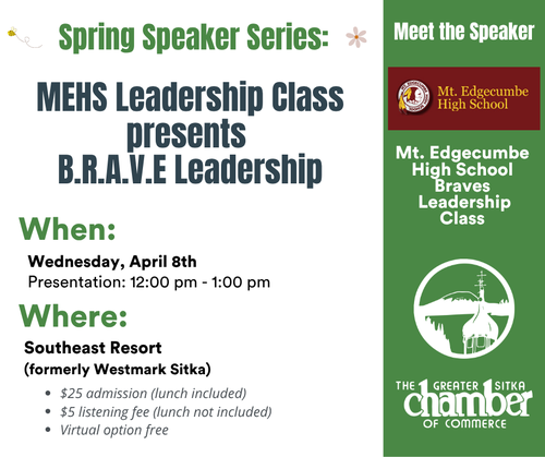Join us for our Spring Speaker Series on Wednesday, April 8th. This week, we will hear from students in the Brave Leadership Class at Mt. Edgecumbe High School as they share the tools they implement when identifying "probletunities" (problems, challenges and opportunities) and what it is to be a B.R.A.V. E Leader.